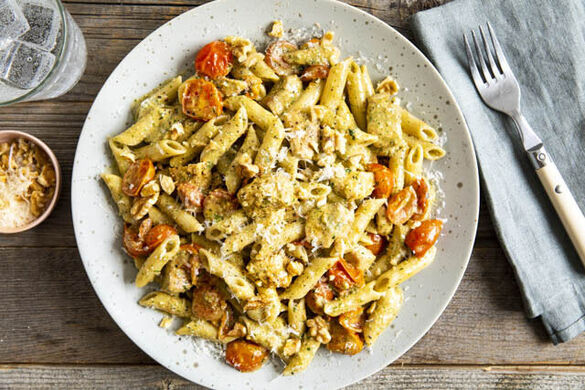Das „Hähnchen“ und die Tomaten auf der Pasta anrichten, mit dem restlichen Käse und den restlichen Walnüssen garnieren und servieren.