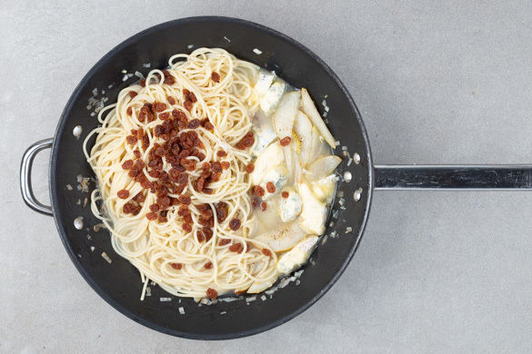 Die Pasta, den Blauschimmelkäse und die Sultaninen zu den Birnen in die Pfanne geben und alles gut vermengen, dabei 200ml Pastawasser zugeben und die Pasta bei geringer Hitze garen, bis der Blauschimmelkäse geschmolzen und die Sauce schön cremig ist. Bei Bedarf mehr Pastawasser unterrühren. Mit Salz und Pfeffer abschmecken.
