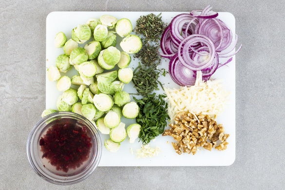 Den Rosenkohl halbieren. Die Kräuter abzupfen und separat fein hacken. Den Knoblauch schälen und fein würfeln. Die Zwiebeln schälen und in sehr feine Ringe schneiden. Die Walnüsse grob hacken. Den Käse grob reiben. Die Cranberrys grob hacken und in 50ml Wasser einweichen.