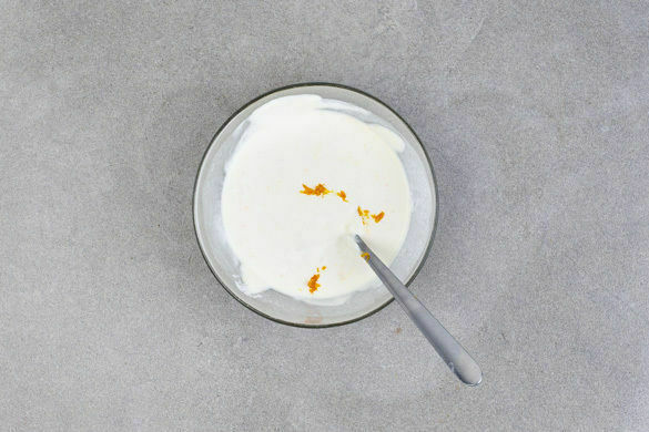 Ca. 1TL Orangenschale abreiben, dann die Orange halbieren und auspressen. Die Crème fraîche mit der Orangenschale, 1–2EL Orangensaft und 1–2EL Zucker verrühren. Nach Geschmack mehr Zucker hinzugeben.