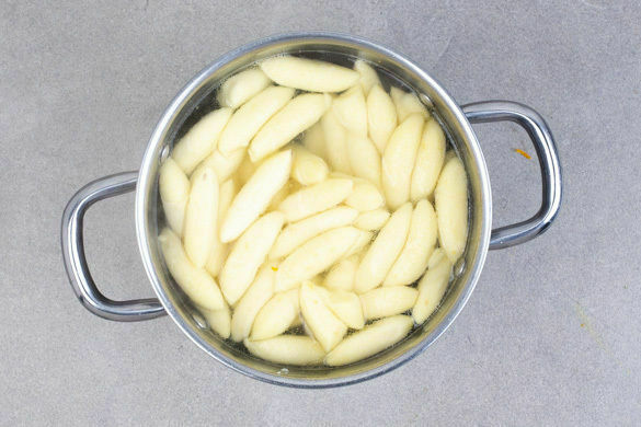 Die Schupfnudeln in das kochende Wasser geben, die Hitze reduzieren und die Schupfnudeln ca. 5Min. im heißen Wasser ziehen lassen. In ein Sieb abgießen und abtropfen lassen.