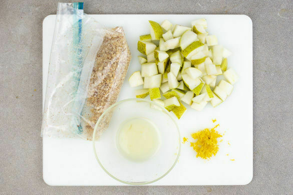 Die Nüsse erst grob hacken, dann in eine Plastiktüte geben und mit einem Nudelholz oder einer schweren Pfanne fein zerstoßen. Die Birnen vierteln, entkernen und in ca. 1cm große Würfel schneiden. Die Zitronenschale abreiben, dann die Zitrone halbieren und auspressen.