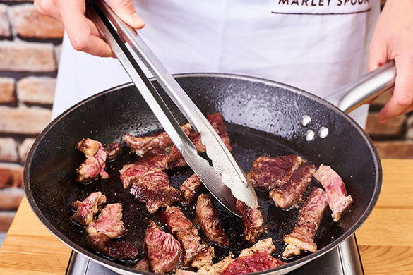 Das Fleisch mit etwas Küchenkrepp trocken tupfen und in einer mittelgroßen Pfanne mit 1–2EL Pflanzenöl bei starker Hitze ca. 2Min. scharf anbraten, dabei kräftig mit Salz und Pfeffer würzen. Das Fleisch aus der Pfanne nehmen und beiseitestellen.