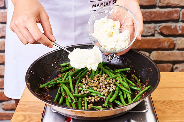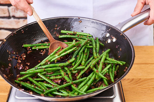 In derselben Pfanne die Bohnen und die Zwiebeln ca. 2–3Min. anbraten.