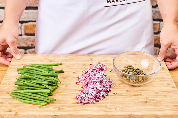 In einem mittelgroßen Topf ausreichend leicht gesalzenes Wasser für die Pasta zum Kochen bringen. Die Zwiebel schälen und in feine Würfel schneiden. Die holzigen Enden der Bohnen abschneiden. Die Kapern in einem Sieb abtropfen lassen.