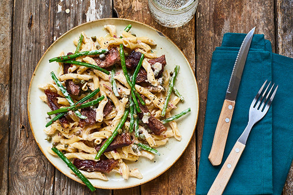 Zarte Rindersteakstreifen, herzhafte Kapern, knackige grüne Bohnen und Schmand werden zu einem herrlich cremigen Ragout gekocht, dazu gibt es Torchiette, die die köstliche Sauce richtig schön aufsaugen. Noch etwas Käse darübergestreut und schon kann es losgehen!