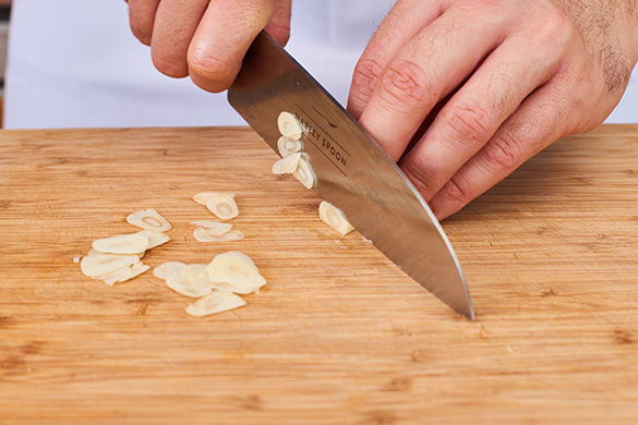 Während das Gemüse im Ofen ist, den Knoblauch schälen und in feine Scheiben schneiden.