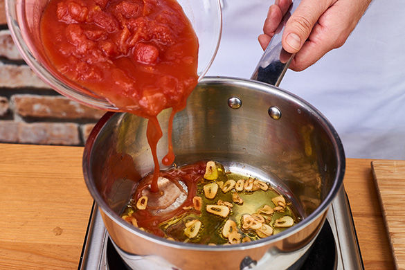 In einem Topf 1-2EL Öl auf mittlere Stufe erhitzen und den Knoblauch ca. 1-2Min. darin goldbraun rösten. Aufpassen, dass er nicht zu dunkel wird, sonst wird er sehr bitter. Die Tomaten und die Hälfte des Paprikapulvers dazugeben und für ca. 5Min. bei mittlerer Hitze einkochen lassen. Mit Salz, Pfeffer und einer Prise Zucker abschmecken.
