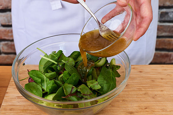 Inzwischen die Gurke schälen, längs halbieren, nach Wunsch das Kerngehäuse mit einem Löffel herausschaben und die Gurke in dünne Scheiben schneiden. Saft der Zitrone auspressen. Nun in einer großen Schüssel 2EL Zitronensaft, 1-2EL Öl, Salz und Pfeffer mit der Gurke und dem Salat vermischen.