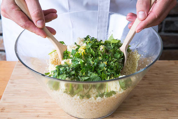 Inzwischen den Bulgur abtropfen lassen. Zusammen mit den Kräutern, 2EL Zitronensaft sowie 1-2EL Olivenöl vermischen und mit Salz und Pfeffer abschmecken. Tomaten unterheben.