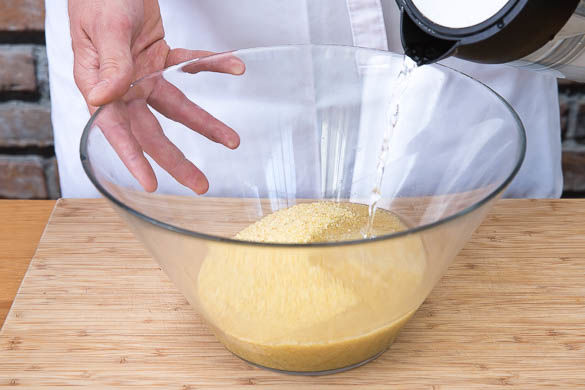 Den Grill auf Temperatur bringen bzw. den Ofen auf 220°C Grillfunktion vorheizen. Die Holzspieße in einem Gefäß mit Wasser einweichen. In einem Wasserkocher 1l Wasser zum Kochen bringen und den Bulgur in einer Schüssel damit übergießen. Mit einem Teller bedeckt ca. 15-20Min. quellen lassen. Hin und wieder mit einer Gabel auflockern.