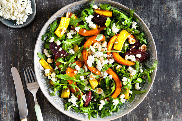 Du willst auch in der kalten Jahreszeit fit und gesund bleiben? Kein Problem mit diesem köstlichen Gemüsegericht! Pastinake, Rote Bete und Hokkaidokürbis werden mit Ras-el-Hanout-Gewürzmischung verfeinert und im Ofen goldbraun geröstet. Serviert mit Rucola und garniert mit herzhaft-cremigem Feta sowie einem leckeren Haselnussdressing ein toller Mix an Farben und Vitaminen!
