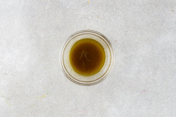 2EL Olivenöl mit dem Himbeeressig und dem Ahornsirup verrühren und das Dressing mit Salz und Pfeffer abschmecken.