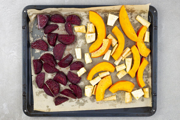 Den Backofen auf 230°C Umluft (250°C Ober-/Unterhitze) vorheizen. Den Kürbis halbieren, mit einem Löffel entkernen und in ca. 2cm breite Spalten schneiden. Die Roten Beten nach Belieben schälen und in 1–2cm breite Spalten schneiden. Die Pastinake schälen, längs halbieren und in ca. 2cm breite Stücke schneiden.