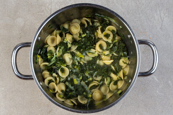 Die Pasta und das Brühgewürz unterrühren und 1,2–1,5L heißes Wasser angießen, bis alles gut bedeckt ist. Einen Deckel auflegen und die Flüssigkeit zum Kochen bringen, dann ohne Deckel 10–15Min. sanft köcheln lassen, bis die Pasta bissfest ist. Bei Bedarf etwas Wasser nachgießen oder die Hitze am Ende erhöhen, wenn die Pasta gar ist, aber noch zu viel Wasser im Topf ist.