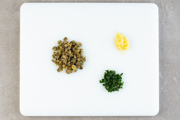 Die Kapern in einem Sieb abtropfen lassen und mit etwas Küchenkrepp trocken tupfen, dann fein hacken. Den Knoblauch schälen und sehr fein würfeln oder durch eine Knoblauchpresse drücken. Den Schnittlauch in kleine Röllchen schneiden.