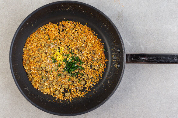 Die Kapern und den Knoblauch in einer großen Pfanne mit 3EL Olivenöl bei mittlerer Hitze ca. 1Min. anbraten. Das Panko-Paniermehl unterrühren und unter regelmäßigem Rühren in 3–4Min. goldbraun rösten. Mit Salz und Pfeffer würzen, dann ca. 2 TL Zitronenabrieb und den Schnittlauch untermischen.