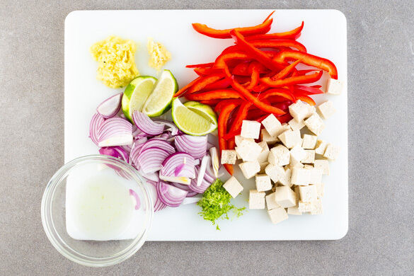 Den Tofu in ca. 1cm große Würfel schneiden. Die Paprika halbieren, entkernen und in dünne Streifen schneiden. Die Zwiebel schälen, halbieren und in feine Streifen schneiden. Den Knoblauch und den Ingwer schälen und fein würfeln. Die Limettenschale abreiben und die Limette halbieren, eine Hälfte auspressen, die andere Hälfte in Spalten schneiden.