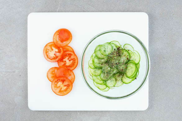Die Gurke schälen und in feine Scheiben schneiden. Mit 3–4 Prisen Salz, Pfeffer und Zucker sowie 1TL Essig würzen. Die Tomaten vom Strunk befreien und in dünne Scheiben schneiden.