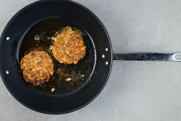 Die Jackfrucht mit 4–6EL Mehl vermengen, in 4 gleich große Pattys formen und in der Pfanne mit 2–3EL Olivenöl bei mittlerer Hitze auf jeder Seite 3–5Min. knusprig anbraten.