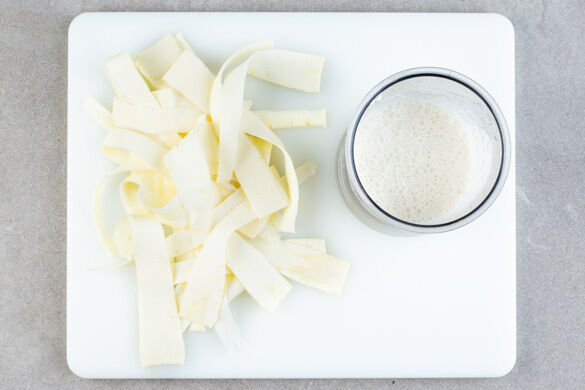 Den Backofen auf 200°C Umluft (220°C Ober-/Unterhitze) vorheizen. Den Knoblauch schälen und halbieren. Die Pastinaken schälen, dann mit dem Sparschäler in dünne Streifen schneiden. Das Pastinakenherz in kleine Würfel schneiden und mit dem Knoblauch und 2/3 der Sojasahne in einem hohen Gefäß pürieren. Mit Salz und Pfeffer abschmecken.