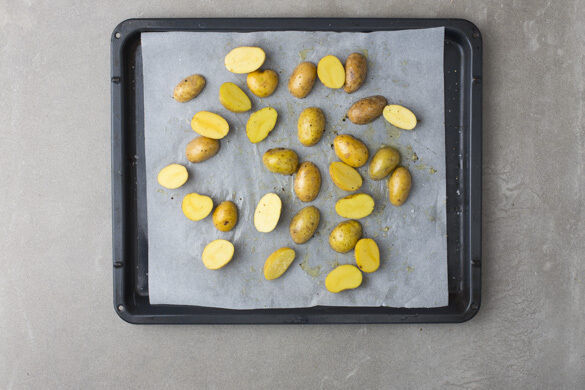Die Kartoffeln samt Schale in max. 0,5cm dünne Scheiben schneiden und auf einem mit Backpapier ausgelegten Backblech mit 1EL Pflanzenöl beträufeln und 1 Prise Salz vermengen. Gleichmäßig verteilen und 15–20Min. im Ofen rösten. In einem mittelgroßen Topf ausreichend gesalzenes Wasser für das Gemüse zum Kochen bringen.