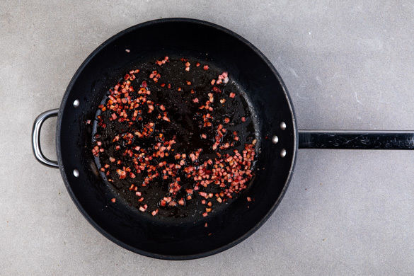 Den Speck in einer großen Pfanne mit 1EL Olivenöl 4–5Min. kross anbraten. 1–2EL gebratenen Speck für die Garnitur beiseitelegen. In einem großen Topf ausreichend gesalzenes Wasser für die Ravioli zum Kochen bringen.