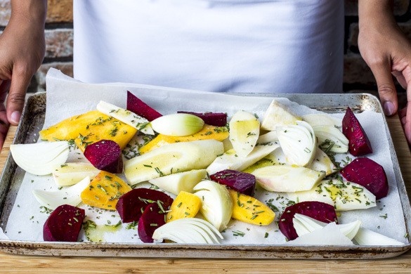 Die Zwiebelspalten, die Rote Bete, die Karotten und die Petersilienwurzeln auf ein mit Backpapier ausgelegtes Backblech geben und mit dem Rosmarin, 1EL Olivenöl sowie je 1 Prise Salz, Pfeffer und Zucker vermengen. Das Gemüse gleichmäßig verteilen und 10–15Min. im Ofen rösten.