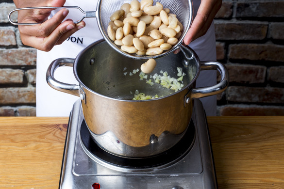 Währenddessen die Zwiebelwürfel in einem kleinen Topf mit 1EL Butter ca. 1Min. bei mittlerer Hitze glasig anbraten. Die Bohnen mit 50ml Wasser dazugeben und alles 5–6Min. köcheln lassen.