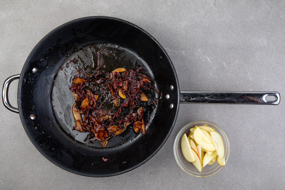 Den Apfel halbieren, entkernen und in dünne Scheiben schneiden. Die 1/2 der Zwiebeln aus der Pfanne nehmen. Ca. 3/4 der Äpfel mit 2–3TL Essig in die Pfanne geben und 4–5Min. bei mittlerer Hitze garen, bis die Äpfel weich sind. Mit Salz und Pfeffer abschmecken. Die Burgerbrötchen ca. 4Min. im Ofen aufbacken.