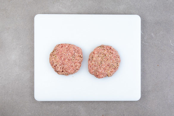 Das Hackfleisch mit dem Senf und 1/2TL Salz und Pfeffer verkneten, dann 2 gleich große Pattys formen. Die Pattys sollten 1–1,5cm dick und etwas größer als die Burgerbrötchen sein.