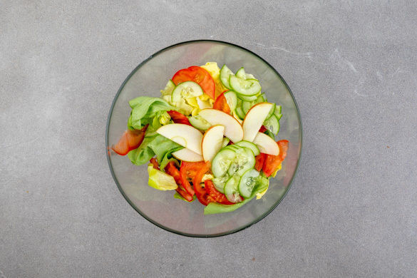 2 Salatblätter abzupfen und beiseitelegen, den restlichen Salat in 2–3cm große Stücke zupfen. Die Gurke längs halbieren und in dünne Scheiben schneiden. Die Tomaten halbieren und in dünne Spalten schneiden, dabei den Strunk entfernen. Einige Tomaten für die Burger beiseitelegen.