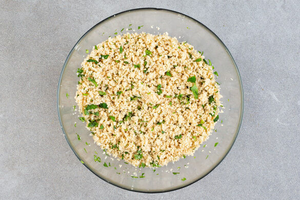 Den Couscous in das kochende Wasser rühren, dann den Topf vom Herd nehmen und den Couscous abgedeckt 8–10Min. quellen lassen.
