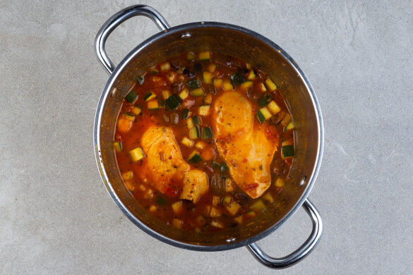 Das Fleisch trocken tupfen, jeweils längs halbieren und von beiden Seiten mit Salz und Pfeffer würzen. Zum Gemüse in den Topf geben und darauf achten, dass das Fleisch vollständig von Flüssigkeit bedeckt ist, dann bei starker Hitze 7–10Min. garen, bis das Fleisch durch ist.