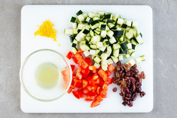 Die Zucchini in ca. 1cm große Würfel schneiden. Die Tomaten ebenfalls in ca. 1cm große Würfel schneiden, dabei den Strunk entfernen. Die Oliven grob hacken. Die Zitronenschale abreiben, dann die Zitrone halbieren und auspressen.