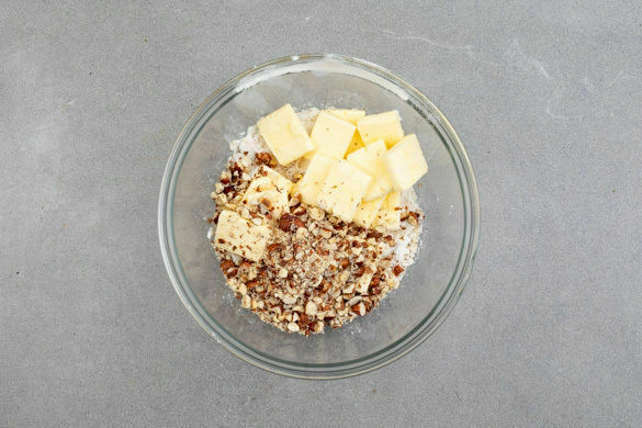 Die Haselnüsse mit dem Boden einer schweren Pfanne oder einem Fleischklopfer noch in der Tüte klein klopfen und anschließend zur Mehlmischung geben. Die Butter mit den Fingerspitzen in den Streuselmix reiben, sodass eine gleichmäßige, bröselige Textur entsteht. Bei Bedarf noch etwas Pflanzenöl einarbeiten.
