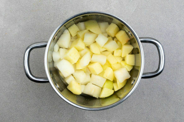 Die Birnen und die Äpfel schälen, entkernen und in ca. 1,5cm große Stücke schneiden. Den Ingwer schälen und fein reiben.