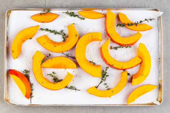 Den Ofen auf 220°C Umluft (240°C Ober-/Unterhitze) vorheizen. Den Kürbis halbieren, entkernen, in 2cm dicke Scheiben schneiden und auf einem mit Backpapier ausgelegten Blech mit dem Thymian, 1EL Olivenöl und je 1 kräftigen Prise Salz und Pfeffer vermengen, ggf. ein weiteres Blech verwenden. Im Ofen 20–25Min. rösten, bis der Kürbis goldbraun und gar ist, nach der Hälfte der Zeit wenden.