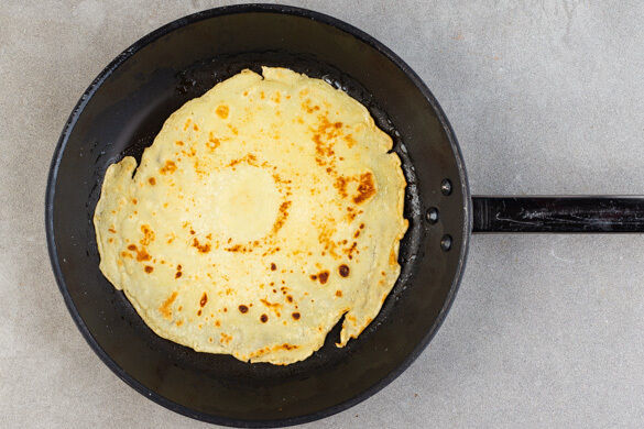 125g Mehl, 125ml Milch, 75ml Wasser, 1EL Olivenöl, 1 Ei und 2 Prisen Salz zu einem glatten Teig verrühren und in einer mittelgroßen Pfanne zu dünnen Pfannkuchen ausbacken, ggf. eine zweite Pfanne verwenden. Dafür je 1 Kelle Teig mit 1EL Olivenöl bei niedriger bis mittlerer Hitze 1–2Min. anbraten, wenden und ca. 1Min. braten. Die Crespelle bis zum Servieren warm halten.