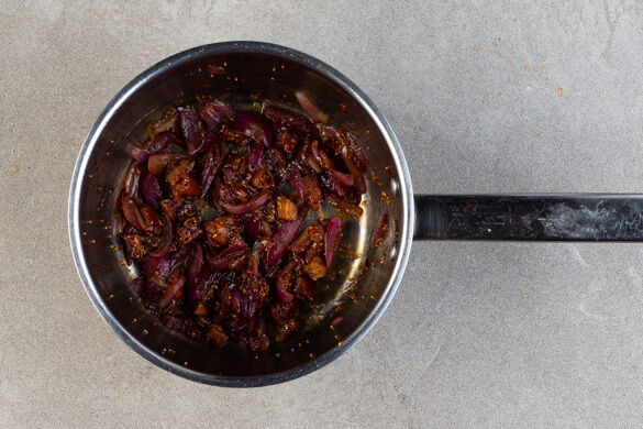 Die Zwiebeln schälen, halbieren, in schmale Spalten schneiden und in einem kleinen Topf mit 1EL Olivenöl und 1 kräftigen Prise Salz bei mittlerer Hitze ca. 4Min. anschwitzen. Die Hitze reduzieren und die Feigen zugeben. 4EL Wasser, 1EL Balsamicoessig und 1/2TL Honig einrühren und bei niedriger Hitze ca. 4Min. einköcheln lassen.