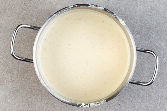 Nach und nach unter ständigem Rühren die 300ml Milch zufügen. Bei mittlerer Hitze 1–3Min. leicht eindicken lassen und vom Herd nehmen. Den Käse unterrühren und die Sauce mit Salz und Pfeffer abschmecken, ggf. mehr Milch einrühren.