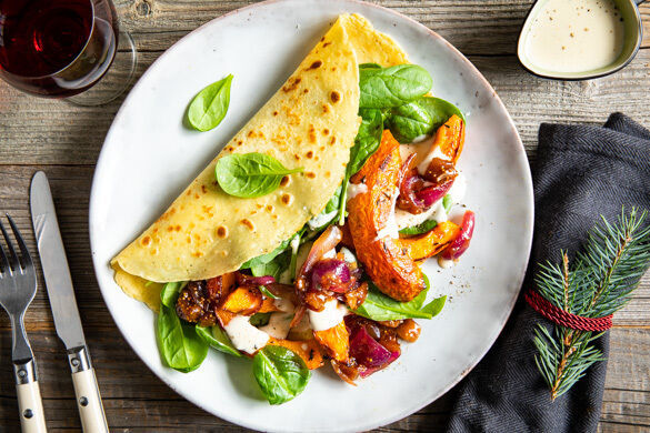 Crespelle sind die italienische Antwort auf Crêpes. Und sie sind richtig gutes Comfort-Food nach dem ganzen Vorweihnachtsstress! Der ist ja jetzt zum Glück erst mal vorbei – solange wir es uns mit diesem Leckerbissen gut gehen lassen. Als Füllung glänzen gebackener Hokkaidokürbis mit Thymiannote, zart-frischer Babyspinat, rote Zwiebeln und süßlich-aromatische Feigen, dazu noch eine cremige Käsesauce ... hach, lecker!