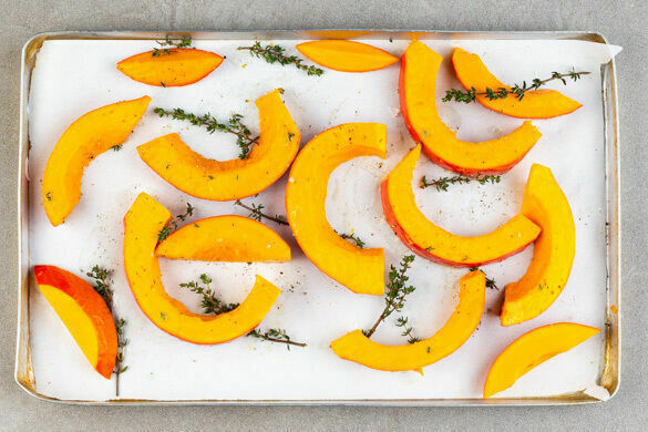 Den Ofen auf 220°C Umluft (240°C Ober-/Unterhitze) vorheizen. Den Kürbis halbieren, entkernen, in 2cm dicke Scheiben schneiden und auf einem mit Backpapier ausgelegten Blech mit dem Thymian, 2EL Olivenöl, 1/2TL Salz und 1 kräftigen Prise Pfeffer vermengen, ggf. ein zweites Blech verwenden. Im Ofen 20–25Min. rösten, bis der Kürbis goldbraun und gar ist, nach der Hälfte der Zeit wenden.