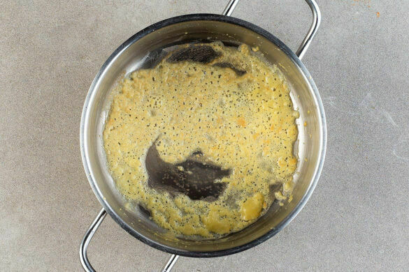 300ml Milch abmessen und bereitstellen. Den Emmentaler und den Hartkäse grob reiben. Den Knoblauch schälen, fein würfeln und in einem kleinen Topf mit 1EL Butter bei mittlerer Hitze erwärmen. Mit 1EL Mehl bestäuben und mit einem Schneebesen 1-2Min. verrühren, dabei darauf achten, dass die Sauce nicht zu braun wird.