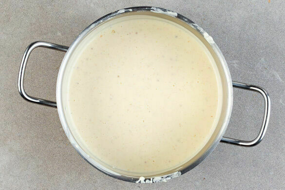 Nach und nach unter ständigem Rühren die 300ml Milch zufügen. Bei mittlerer Hitze 1–3Min. leicht eindicken lassen und vom Herd nehmen. Den Käse unterrühren und die Sauce mit Salz und Pfeffer abschmecken, ggf. mehr Milch einrühren.