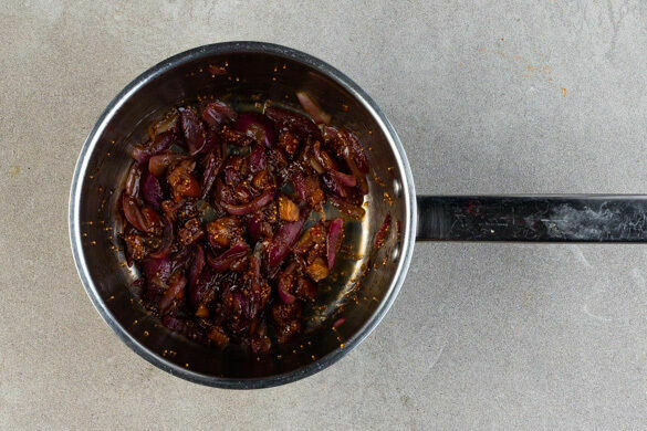 Die Zwiebeln schälen, halbieren, in schmale Spalten schneiden und in einem kleinen Topf mit 1EL Olivenöl und 2 Prisen Salz bei mittlerer Hitze ca. 4Min. anschwitzen. Die Hitze reduzieren und die Feigen zugeben. 6–8EL Wasser, 2–3EL Balsamicoessig und 1TL Honig einrühren und bei niedriger Hitze ca. 4Min. einköcheln lassen.