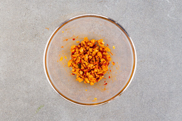 Die Erdnüsse grob hacken und mit 1/3 des Sambal Oelek vermengen. Das Thai-Basilikum grob schneiden. Die Limette in Spalten schneiden.