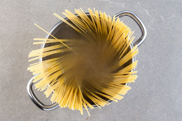 Die Nudeln in das kochende Wasser geben und in 7–9Min. bissfest garen. In ein Sieb abgießen und abtropfen lassen.