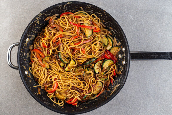 Dies ist mal wieder eines der Gerichte, die sich beim ersten Begutachten nicht sofort erschließen – in der Praxis aber mit drei Bissen verschlungen sind. Die leckere Fusion-Pfanne mit Tempeh, Spaghetti, pikanter Sauce und aromatischem Thai-Basilikum entstammt dem verrückt-genialen Wissenschaftlerhirn unserer Köchin Elisabeth und ist definitiv einen Versuch wert. Vegan und superfix gemacht ist sie auch noch! Was will man mehr?