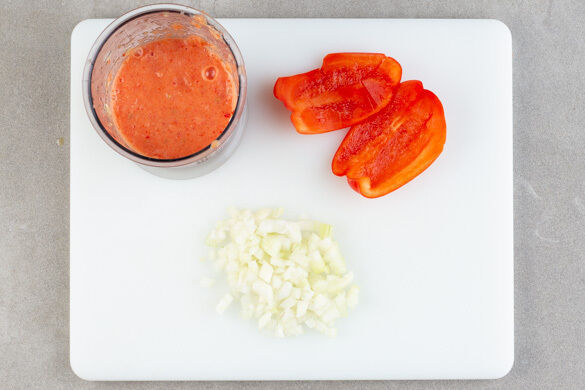 Die Paprika vierteln und entkernen. Die Tomaten vierteln, dabei den Strunk entfernen. Die Zwiebel schälen und halbieren, eine Hälfte erneut halbieren, die andere Hälfte fein würfeln. Die 1/2 der Paprika, die Tomaten, die Zwiebelviertel und die 1/2 der Peperoni mit 1/2TL Salz mit einem Stabmixer in einem hohen Gefäß fein pürieren, ggf. etwas Wasser zufügen.